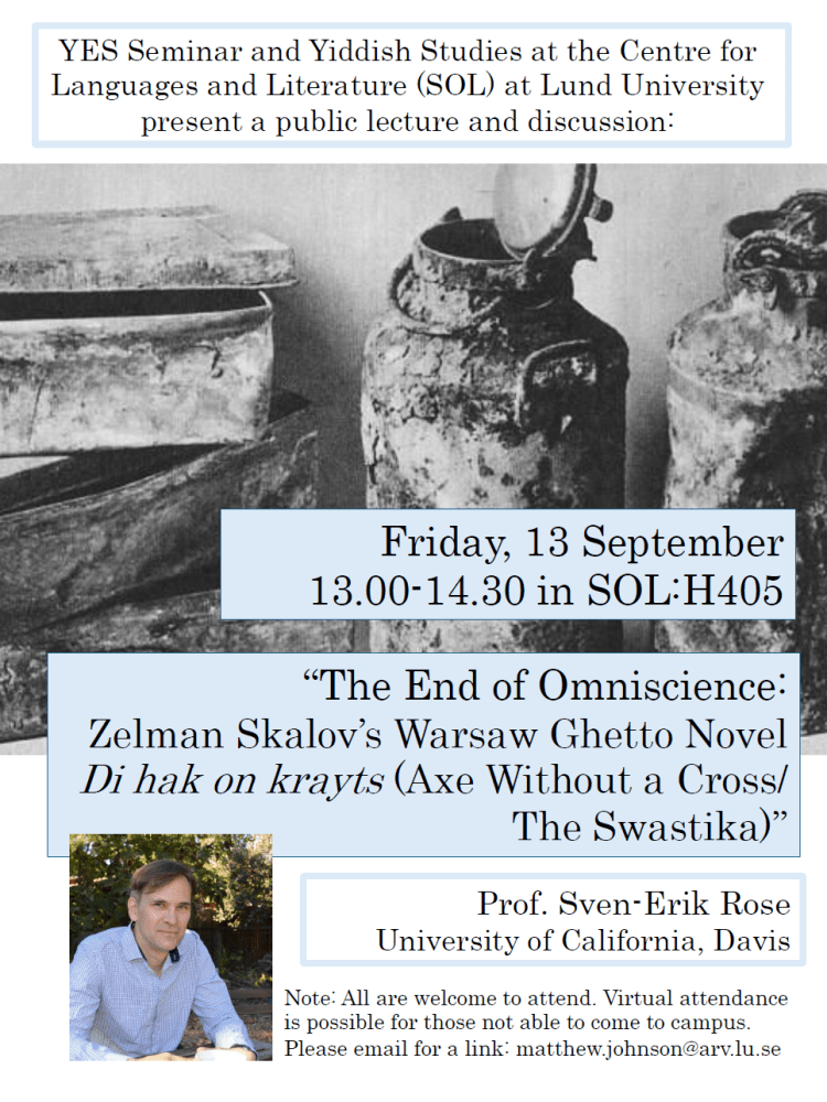 [Reminder] LUND/ZOOM: The End of Omniscience: Zelman Skalov’s Warsaw Ghetto Novel Di hak on krayts (Axe Without a Cross/ The Swastika) Posted byDesirée LindSeptember 12, 2024September 11, 2024Posted inEventTags:Autumn 2024, Event, Lund University, public lecture, september, Sven-Erik Rose, University of California, yiddish See previous post for more information, please click here to find it. Share this: Click to share on X (Opens in new window) X Click to share on Facebook (Opens in new window) Facebook Like Loading...
